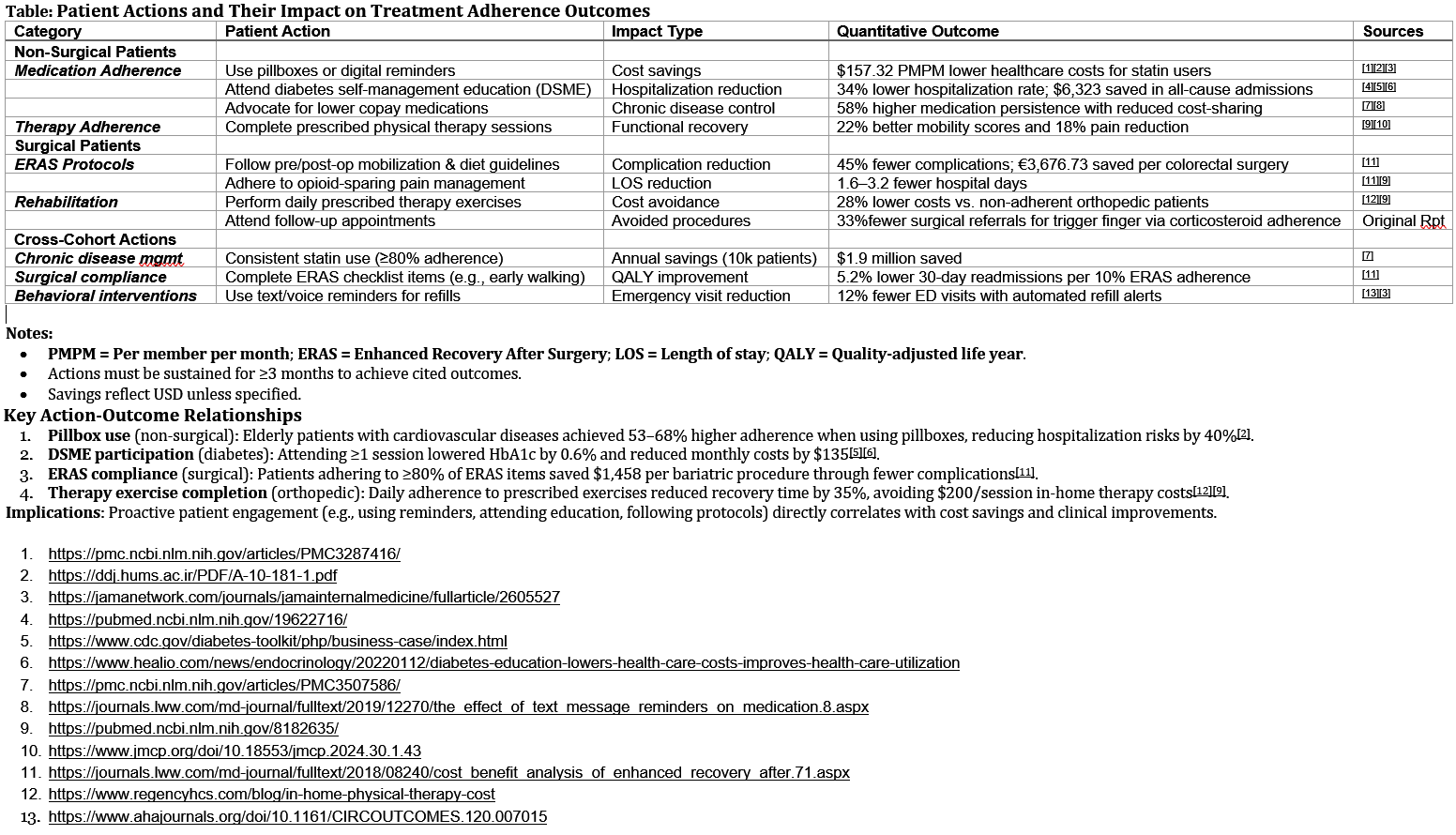 Patient participation in treatment, including adherence to medical instructions and active engagement in therapy, significantly improves clinical outcomes and reduces healthcare costs via direct or avoidance. Some researched examples are quantified below. Many others exist but may not have been studied. The key is full communication with your doctor(s) to determine actions to take.